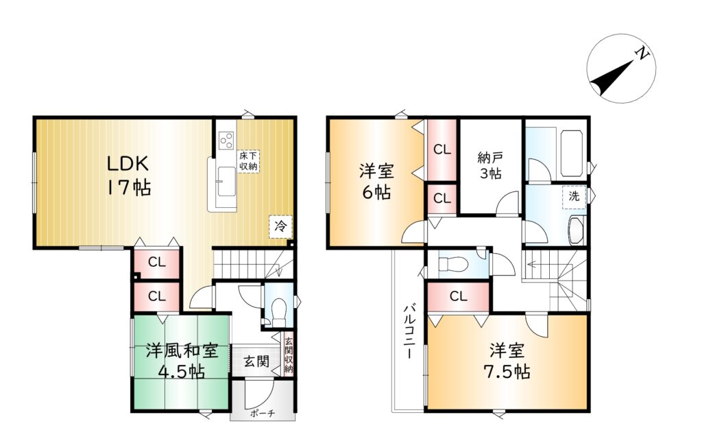 | 土地面積 | 105.01㎡ | 建物面積 | 1階:44.55㎡ 2階:46.17㎡ 合計:90.72㎡ |